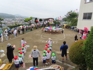 年長はパラバルーン、年中・少はフィンガー・フラーフをもち、心を一つに頑張りました😊