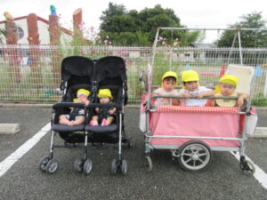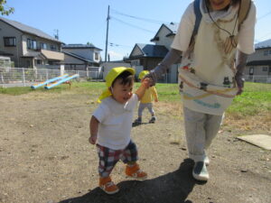 天気の良い日は散歩や園庭遊びを取り入れていきたいと思います。歩行ができるようになり、お家でも外靴を履いて歩いているお友だちは園でも外靴を使用していきたいと思いますので担任に声をかけていただけると助かります。又、靴下を履かないで登園しているお友だちもいるため、靴下を履いて登園してくださるようお願いします。(ひよこ組便りから)