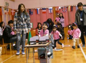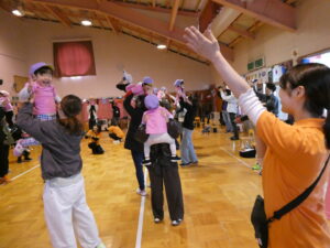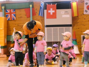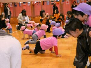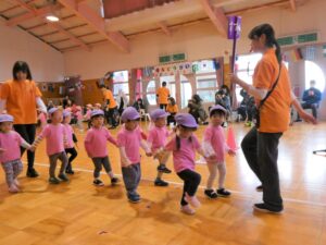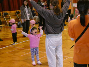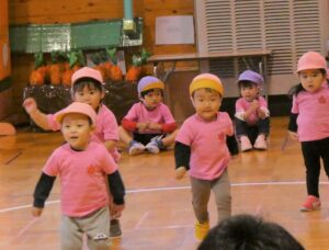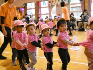 親子ダンスでははじけた笑顔と動きでしたね。どんな一コマも子ども達の成長とかわいさがつまっていて、かけがえのない時間でした。また、おうちの方も、一緒に“バナナ君体操”や“わ~お!”をしていただいたり、張り切って親子競技に参加していただいたおかげで、おうちの方に来て頂くことを楽しみにしていた子ども達は大喜びでした!!