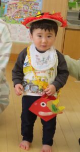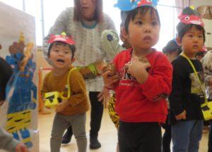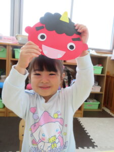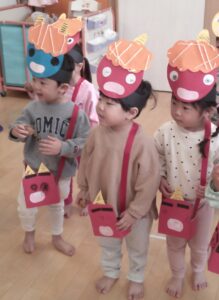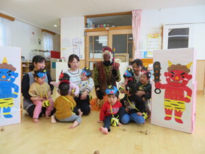 でも力を合わせて豆をぶつけていくと、オニさんは「まいった、参った!」と小さくなってしまいました。「やったあ。」「みんなが良い子になったら、もう帰るよ。」と約束してくれました。よかったね。約束のしるしに記念写真を撮りました。今年も良い子でがんばりましょうね。