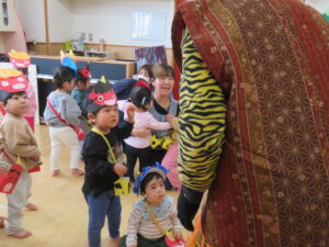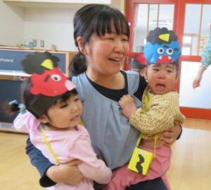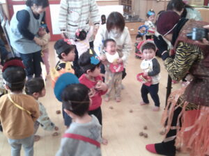 「うおおおおおおおおおあ!!!!!!」と、オニの声が・・・。振り向くとおへやに大きなオニが入ってきました~。みんなはびっくり!あわてて逃げる子、果敢にオニに豆をぶつける子、先生にしがみつく子・・・チビちゃん達は何が何やらわからず、とうとう「えええええ~ん💧」と大コーラスが・・・。