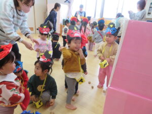 みんなで作ったかわいいお豆をうそっこオニめがけて、「オニは外!福は内!」と元気に投げつけていると・・・・・・