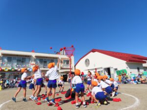 誕生してたった3~5年の子ども達ですのに、なんとすごいこと!徒競走では、何位であろうと最後まで一生懸命走り抜きました。年少の大玉転がしではニコニコと自分と同じ大きさの大玉を最後まで転がしました。年中のクラス対抗の玉入れでは上手にたくさん入れることができるようになりました。親子レースでの満面の笑顔で嬉しそうな姿に応援する私達もニコニコしてしまいました。年長の組体操・クラス対抗リレー・係活動の真剣な姿は、練習や園生活で育まれた一人一人の力が集結しているかのようで、心を打つものがありました。本当に子ども達の力は無限大です。運動会という大きな行事の取り組みを通して、また大きくステップアップした子ども達。