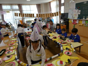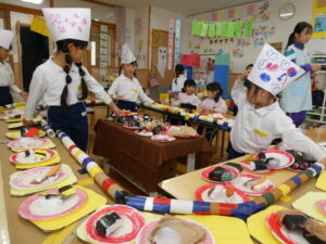 短い秋でしたが、『かぞくごっご』の皆で力を合わせてのさつま芋堀り、栗拾い、遠出の散歩等々、秋を満喫した子ども達。年長は、はと組が『ラーメン屋さん』、かなりや組が『回転寿司』をクラス皆でオープンさせ、年中少さんを招いて大盛況でした。本物顔負けの品物とお店の雰囲気に「すごい!」「大きい組さんみたいにやってみたい!」と刺激を受けて、『ミニ回転すしや』をはじめた年中さんも。互いのクラスを行き来し、異年齢の交流を楽しみ、刺激を受けながら、「こうしたい!」という意欲やイメージが膨らみ、それを形にするにはどうしたらいいか試行錯誤しながら、少しずつ遊びを発展させているこの頃です。