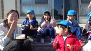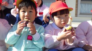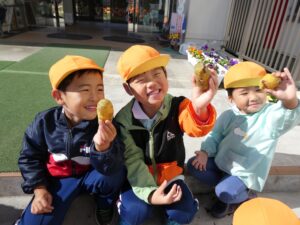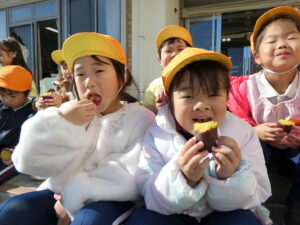 畑で穫れたサツマイモを園庭で、大きなお鍋を使って煮て、さっそくみんなで食べました(^o^)