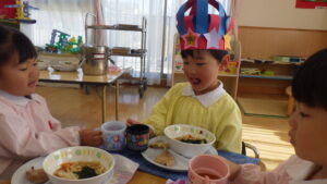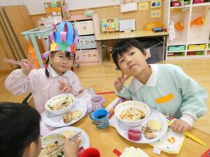 給食時間には、みんなで乾杯してお祝いしました。「お誕生日おめでとう💓」