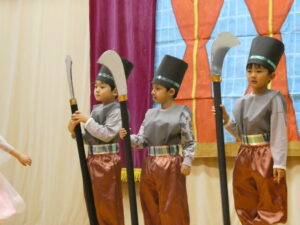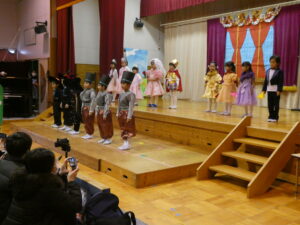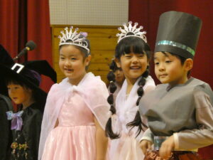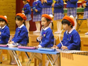 当日は、「緊張してないよ~♪」と言いながらも、本番が近づくにつれ、表情がかたくなってきた子ども達。「お客さんをカボチャだと思えば緊張しないよ。」と1人の子が言い出したのをきっかけに、少し柔らかい表情になり、『シンデレラ』の劇を迎えました。一人ひとりが役になりきり、一人でのセリフも堂々と話したり、跳び箱や縄跳びに挑戦したりと、大勢の前で披露する姿はとても立派でしたね!練習後に、劇練習を振り返る時間をとっていましたが、「○○ちゃんのセリフの言い方が本当に怖くて良かった」「声が大きくて聞こえやすかった」等、友達の姿を認め合いながら練習に取り組んできました。練習を重ねる度に自信がつき、本番では今までの練習の成果を披露することができました。練習では、バラバラだったり、歌詞があやふやだった『歌と合奏』でしたが、本番では息の揃った合奏、元気な声・綺麗な声で歌った歌を披露することができました。