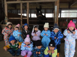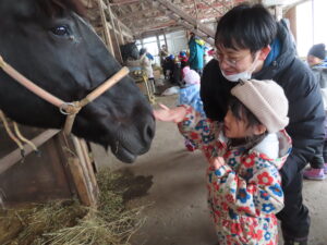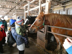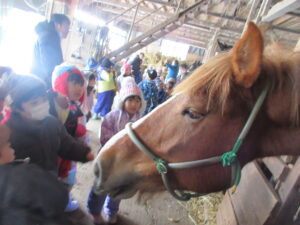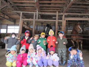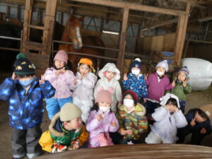 幼稚園部のけろちゃんルームのみんなは、今日の園外保育行事として、なんと!お馬さんの見学に行って来ました。広宮沢に馬を3頭飼っていらっしゃる白沢さんの厩舎があると聞いて、ぜひにとお願いして、みんなでお馬さんに会いに行きました❗チャグチャグ馬コにも参加していて、農耕馬のように馬体ががっしりしているお馬さんなので、みんなびっくり❗