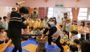 延期となっていた『もちつき』を先日、園で開催しました。杵と臼を使ってのもちつきは今ではなかなか見られない光景ではないでしょうか。蒸した餅米を子ども達の目の前で臼に入れて、力持ちの先生達で「よいしょ!」とつきました。子ども達は輪になって、「1 2 3 ・・・」と数え、100回以上ついてできあがり(^_^)v『あべかわ餅』と『雑煮餅』にして食べました。おかわりした子もいました。(安全に気を付けながら)楽しい日本らしい行事に子ども達の目が輝いて見えました。お餅から力を得て、みんな3学期も元気に過ごしたいと思います。