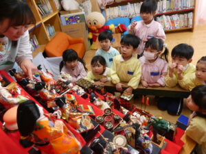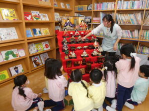 もうすぐ、桃の節句。陽の光や土の匂いが、日ごとに春に向かっていることを感じます。絵本の部屋におひなさまを飾りました。「わあ、きれい❤」とうっとり見たり、よーく見てクラスに戻り、ひな人形製作に取り組んだりしているこの頃子ども達です。